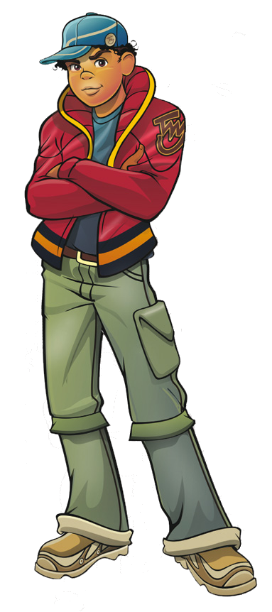 | Para ninguém saber que o garoto tem somente oito fios de cabelo, ele usa um boné vermelho, herdado de seu avô. Torce para o Santos Futebol Clube |
